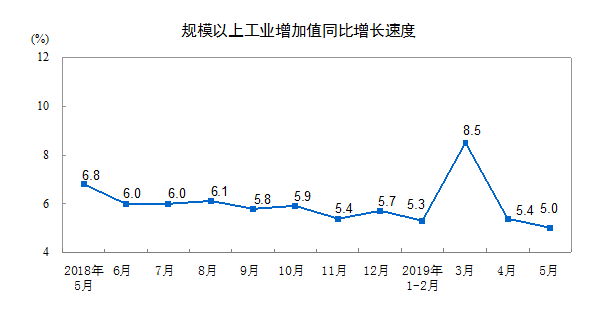 根據(jù)數(shù)據(jù)報(bào)告統(tǒng)計(jì),2019年5月份規(guī)模以上工業(yè)增加值同比實(shí)際增長5.0%(以下增加值增速均為扣除價(jià)格因素的實(shí)際增長率),和上個(gè)月相比回落0.4個(gè)百分點(diǎn)。