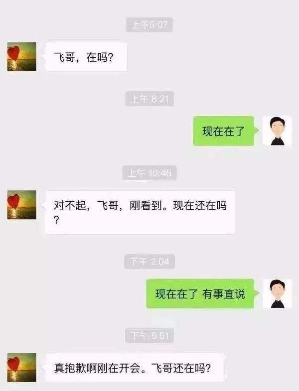 另一方面,當(dāng)你問對方有什么事時(shí),如果對方暫時(shí)不在,隔了一會兒,又會回復(fù)你,這下在了,你還在嗎?這樣一來二去,還沒說到正題時(shí),你已經(jīng)崩潰了。