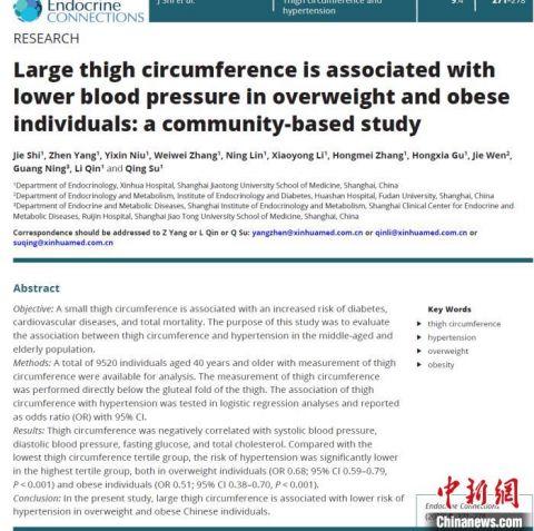 新華醫(yī)院21日披露,該院內(nèi)分泌科蘇青教授和楊振教授組成的研究小組在對(duì)近萬人進(jìn)行的社區(qū)流行病學(xué)調(diào)查中發(fā)現(xiàn),與大腿較瘦的人群相比,他們屬于超重和肥胖人群。然而,大腿粗壯的人患高血壓的風(fēng)險(xiǎn)降低了近30%和50%。