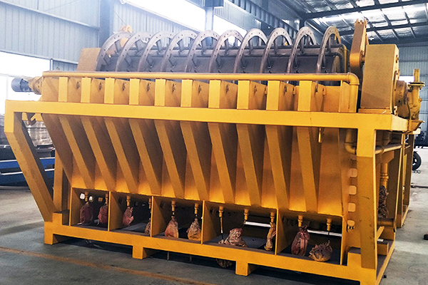 陶瓷過濾機(jī)是礦山特別是選礦廠采用浮選或磁選技術(shù)常用的一種高效節(jié)能的過濾設(shè)備。陶瓷過濾機(jī)分為吸漿區(qū)、干燥區(qū)、卸料區(qū)和反沖洗區(qū)。當(dāng)陶瓷過濾機(jī)開始工作時,濾板浸入漿料槽中。在真空作用下,懸浮在漿槽中的精礦顆粒被吸附在濾板上,固體物料被截留在濾板上,濾液通過濾板。循環(huán)(多余部分也會排出);濾板離開漿槽進(jìn)入干燥區(qū),濾餅在真空作用下繼續(xù)脫水;干燥卸料區(qū)裝有刮板,用于刮除濾餅;卸料完成,濾板進(jìn)入反沖洗區(qū),過濾后的水通過分配頭進(jìn)入濾板,反沖洗濾板以洗掉堵塞在微孔中的顆粒,完成一個過濾操作循環(huán)。