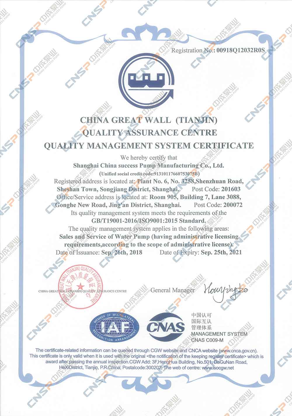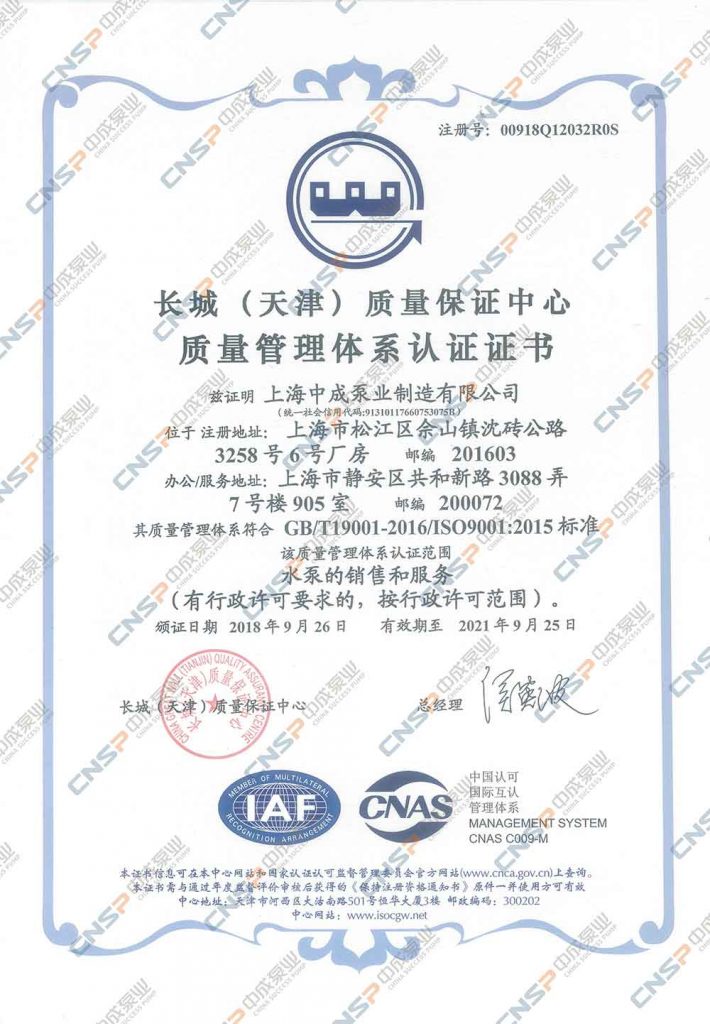 中成泵業(yè)作為一家獨立成熟完整的企業(yè),以自吸泵為主打系列,經(jīng)過長城質(zhì)量保證中心各位專家的審核,滿足GB/T19001:2015質(zhì)量管理體系標(biāo)準(zhǔn)要求,于2018年9月26日頒發(fā)證書。