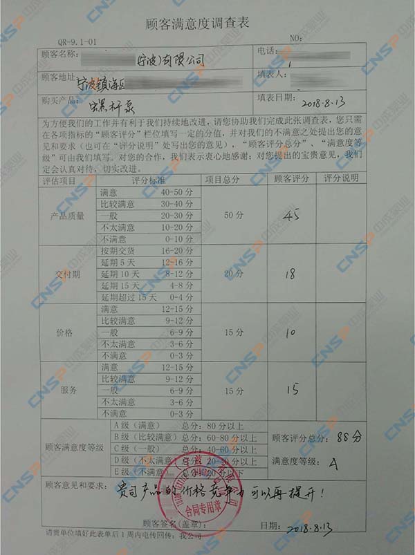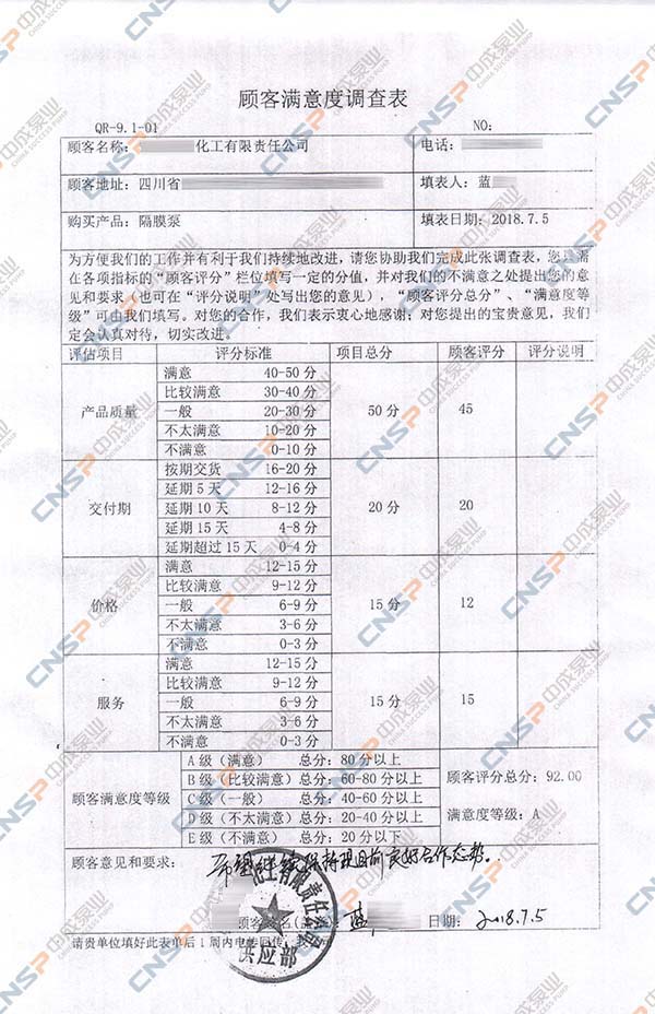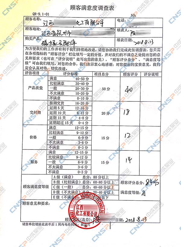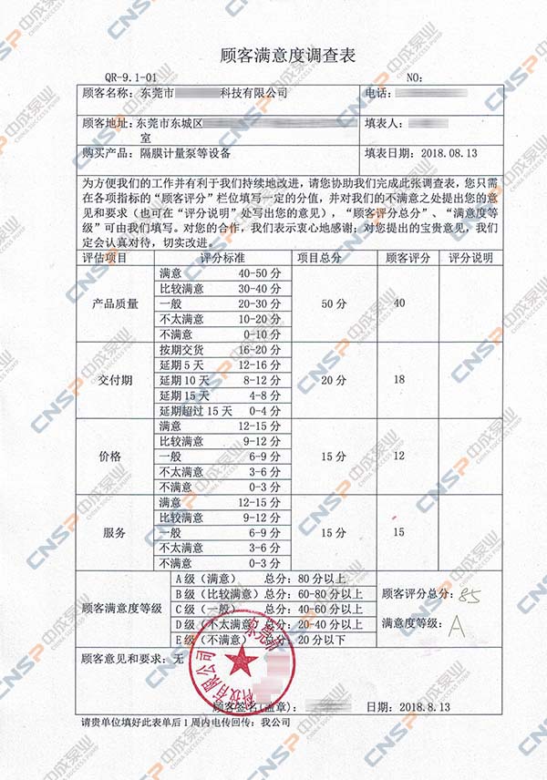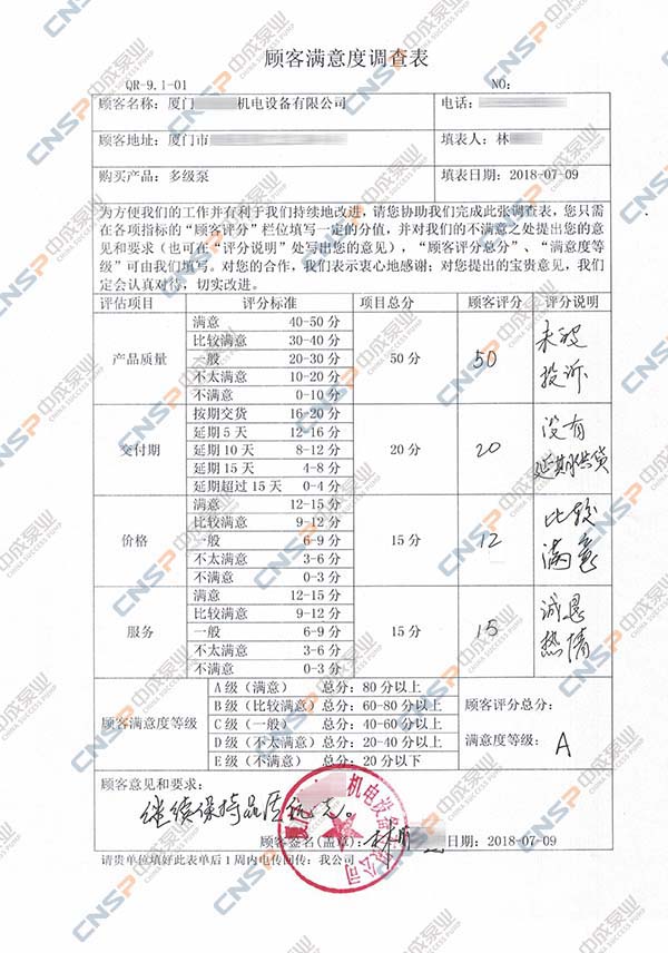 中成泵業(yè)從我們的多級泵、計量泵等產(chǎn)品的客戶中抽選幾名進(jìn)行表格內(nèi)容調(diào)查,客戶反饋成績均為A級,其中螺桿泵、磁力泵、隔膜泵等客戶紛紛表示希望保持合作并對我們的產(chǎn)品持有期望。